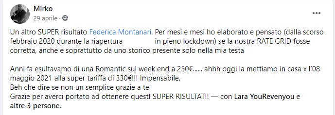 Sto imparando tecniche che mi permettono di ricavare il massimo dalla gestione degli appartamenti, metodi per aumentare la conversione, trick dei vari Ota per aumentare la visibilità. Attraverso i fogli di calcolo preparati ad hoc riesco a monitorare l'andamento delle strutture e questo mi permette di decidere le migliori strategie da attuare in ogni periodo dell'anno.